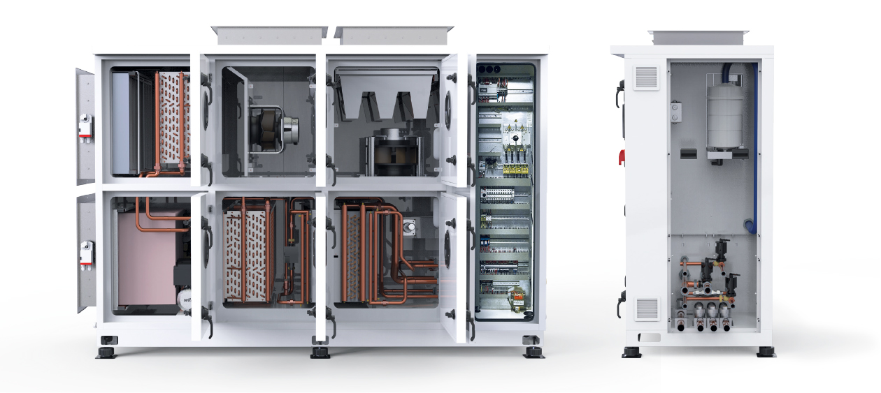 De machines worden in hun standaardconfiguratie geleverd met regelingen voor koelen, verwarmen, bevochtigen en ontvochtigen. Deze onderdelen zijn op maat gemaakt voor de behandeling van 100% buitenlucht of met gedeeltelijke recirculatie, zoals:
